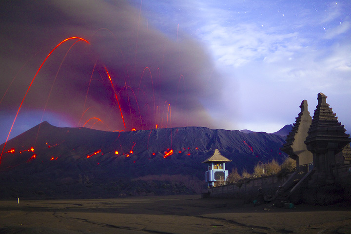 Strombolic activity at Mount Bromo, 2011, with Hindu temple in the foreground.  Image: Tom Pfeiffer