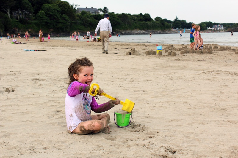 Collecting shells for a sandcastle at Buncrana Beach. We had just been to Granian Aileach where it snowed… in May. It was cold!