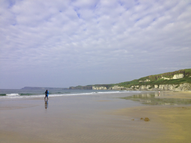 White Rocks beach looking towards Dunluce Castle (perched on the cliff). The monkey stacks at the Giant’s Causeway can be seen in the distance.