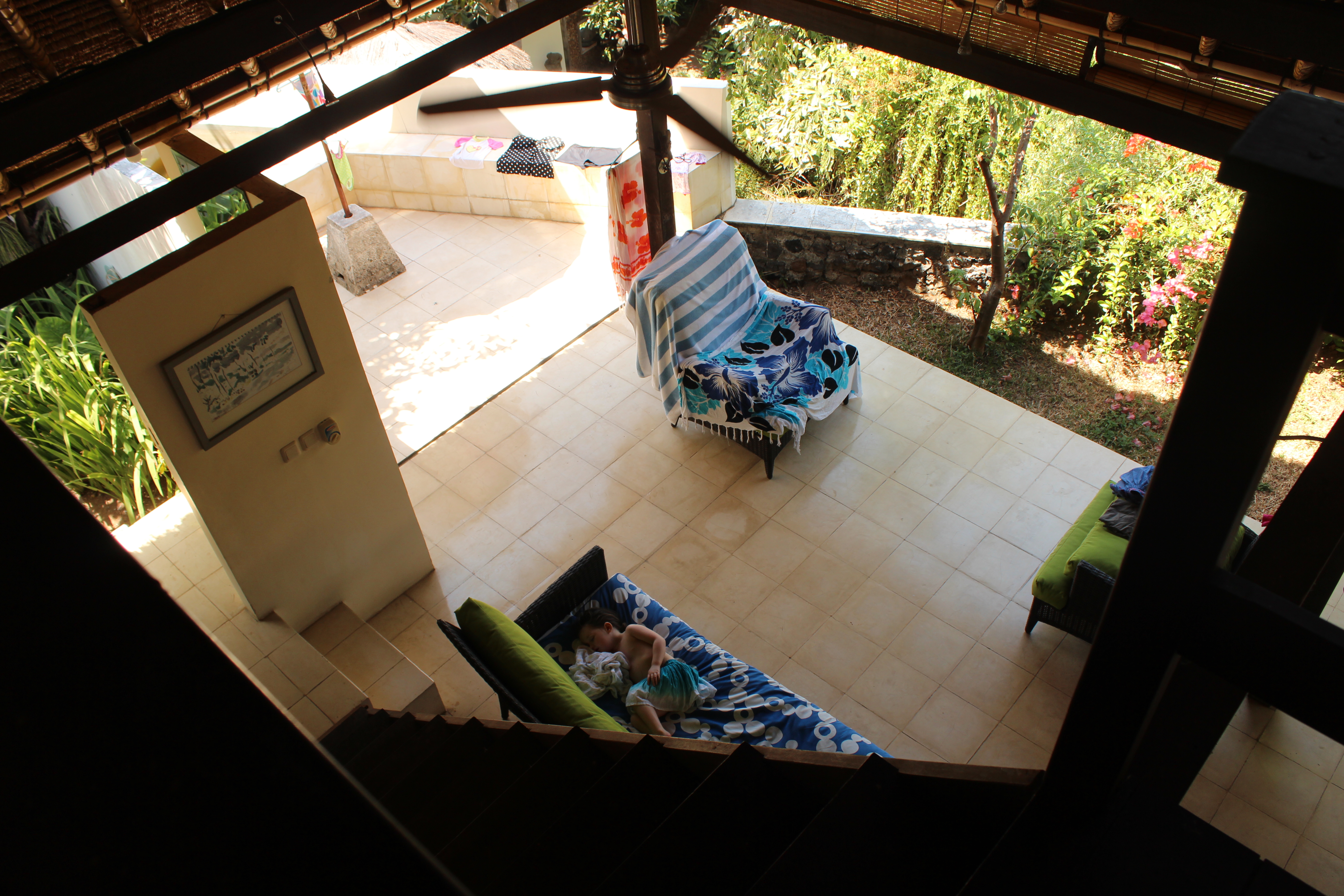 My only reservations was the pond in the corner, which although great to watch the frog spawn wriggling and dragonflies visiting, was still a worry with two little kids under five around. It meant I couldn’t completely relax until they were in their room. And I was slightly horrified at the steep open staircase leading up to the room in the eaves – it was completely devoid of railings so I had visions (in true dramatic mother style) of one of the girls falling onto the speckled stone floor below, brains splashing everywhere. Thankfully, my kids are mostly obedient, so after describing in full multi-coloured gory detail what could happen if they fell from the top, we just made the scary stairs out-of-bounds for the entire stay. I’m not sure two boisterous, inherently danger-seeking boys would be as easily dissuaded though. The only physical barrier I managed to create was to fill two bowls with water and topped them with fallen flowers Bali-style, so every time the girls were tempted by the stairs their attention was stolen by the pretty flowers. They’re easily distracted!