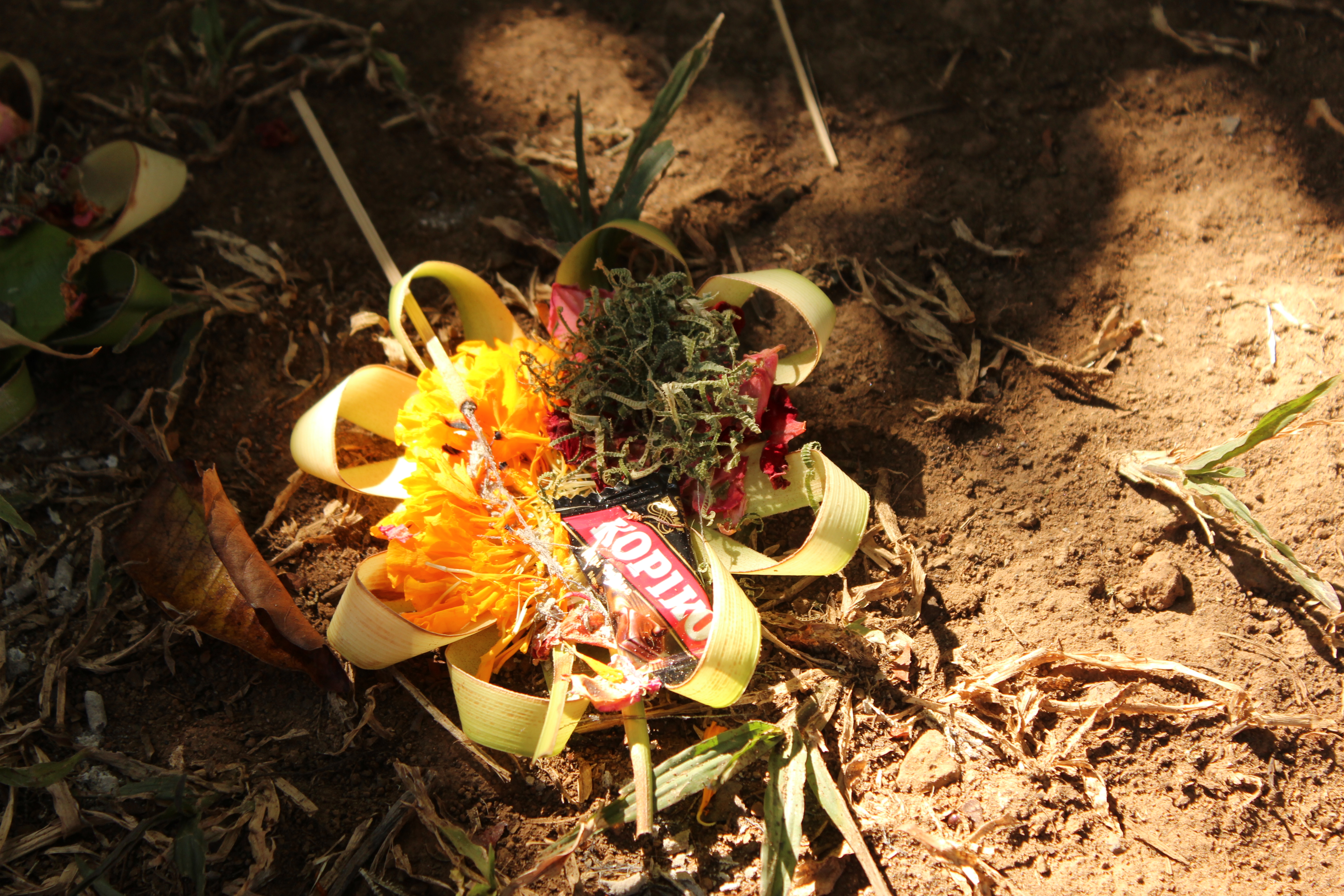 Intricately designed offerings are made by hand using banana leaves. They usually contain a food, coffee and flowers, which are thought to keep the spirits happy.