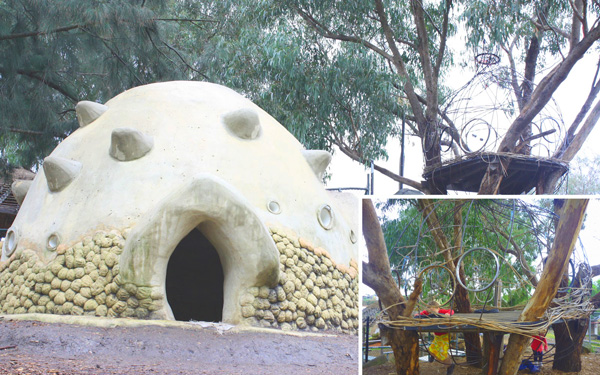 An igloo-style handbuilt hut sits mid-hill, and a treehouse made of twigs and bicycle wheels overlooks the whole park. Nearby an old wooden boat provides plenty of opportunity for imaginative play, and a small sandpit keeps all ages happy. The only thing you have to do is sit back, relax and hope nobody breaks a bone on your watch!