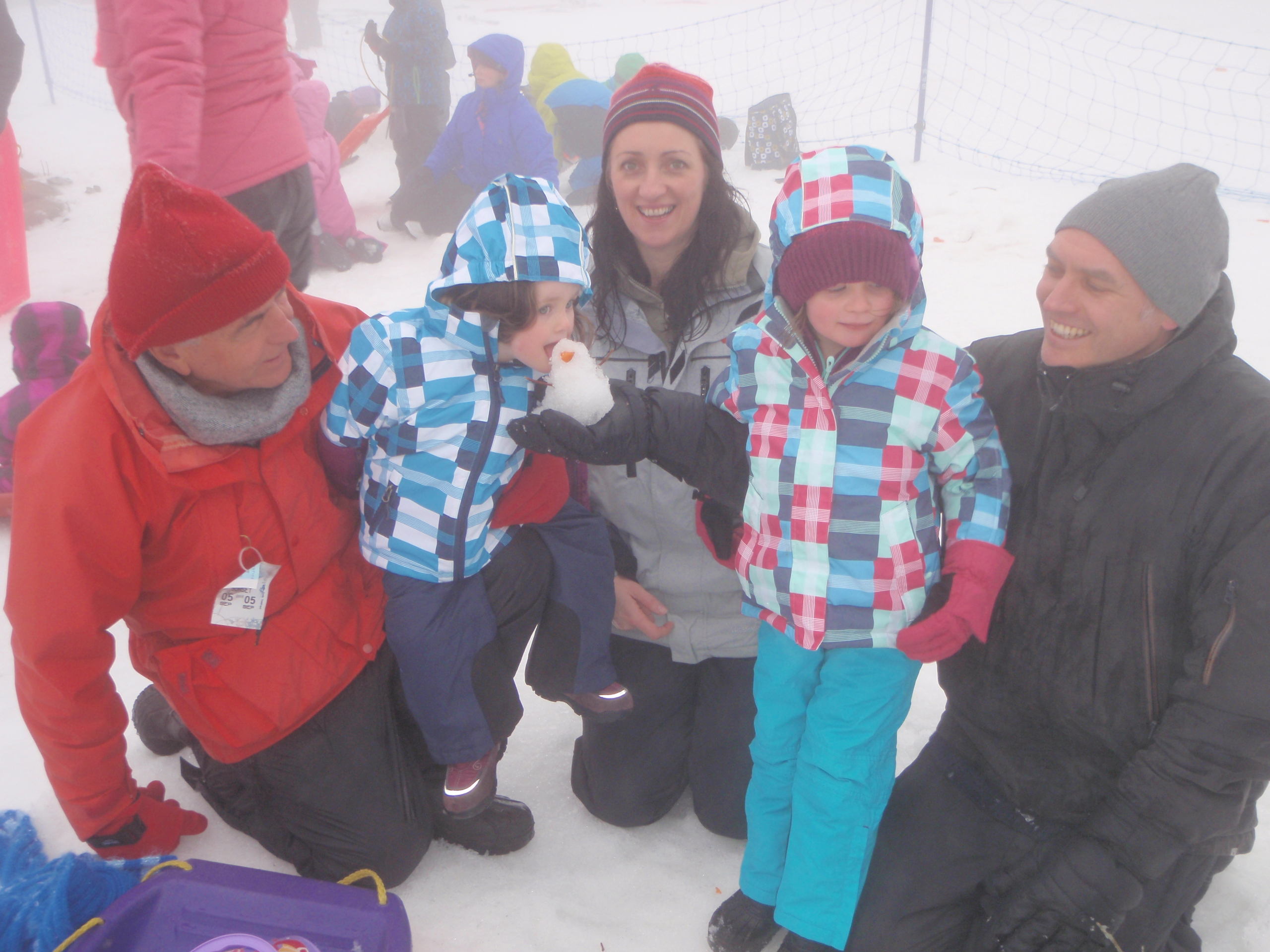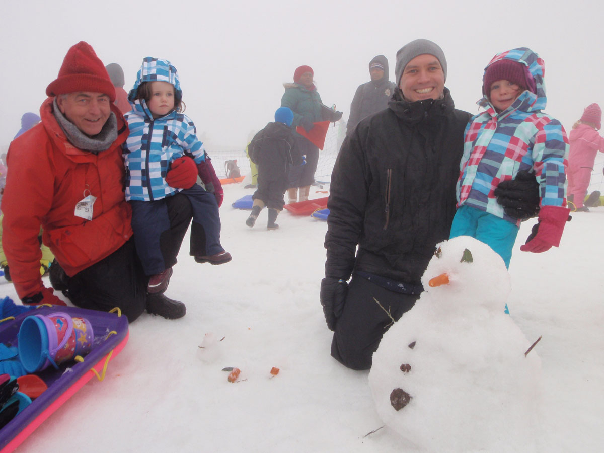 Staying together is a challenge so we mark our territory with a broken stick, tie a coloured string to the top and stick it in the ground. It is tempting to ask the grandparents to guard the spot and stay here while we scoot off to find the toboggan run, but instead I ask them to keep moving and jiggling just in case hyperthermia sets in!