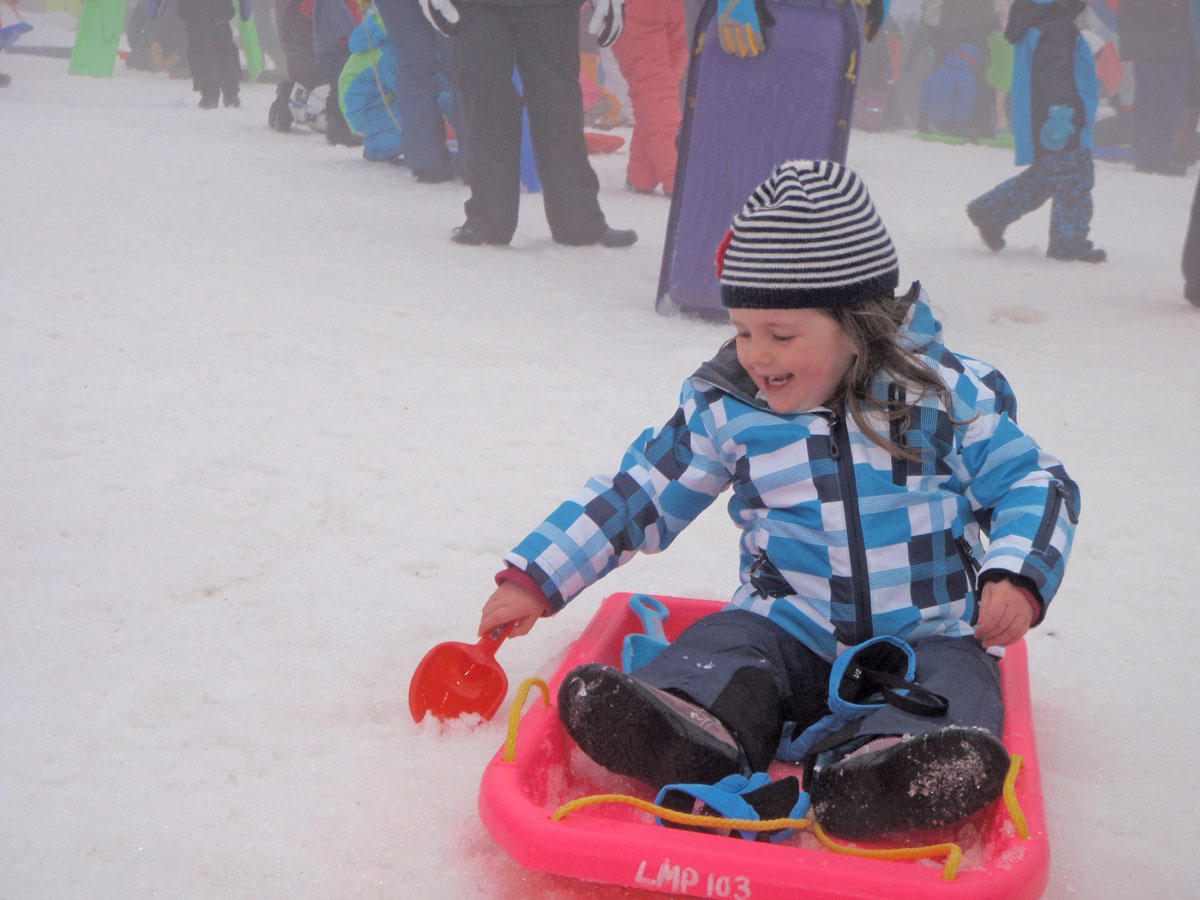 Quickly scanning the crowd of identical outfits and same-sized children, I eventually spot my crazy cat, but not before she goes whooping down the slopes. Thankfully, the padded outfit helps with the inevitable crash at the bottom. Over and over again, she repeats the whoop and sled ride, never tiring of the climb back to the top, always with the same amount of gusto as the first time. More fool anyone standing at the bottom of the slopes… and there seemed to be an awful lot of fools that day!