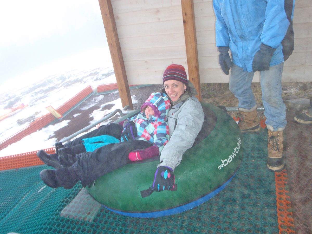 After replenishing the system we seek out the tube ride. Oversized tyre tubes are the mode of transport here. Straddling the tyre, I take Miss 4 on my lap and lay back. Giving a thumb up to the attendant, he pushes us off from the top of the run. The patchwork rubber trellis lining the length of the run makes the perfect slide for tyres and sends us speeding down the slope. It’s the most fun you can have on the mountain without having to touch snow at all. We do it three times, despite the insistent drizzle and threat of chilblains.