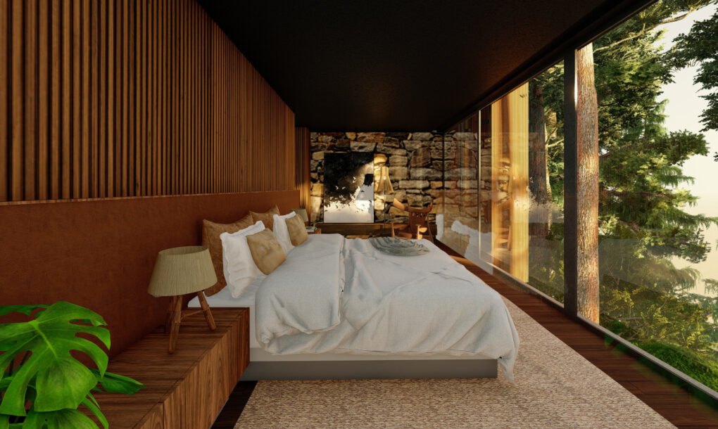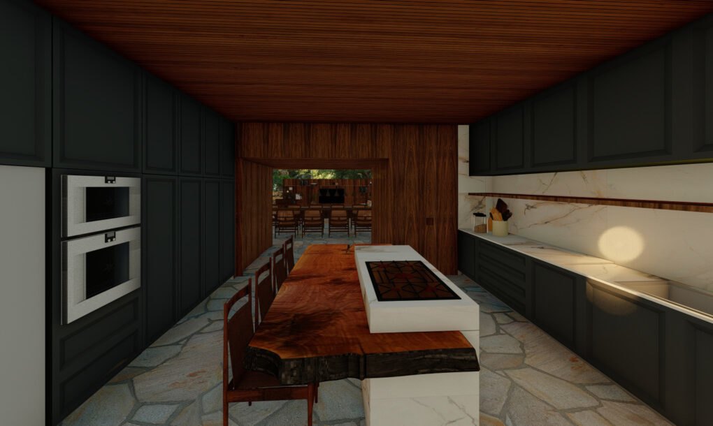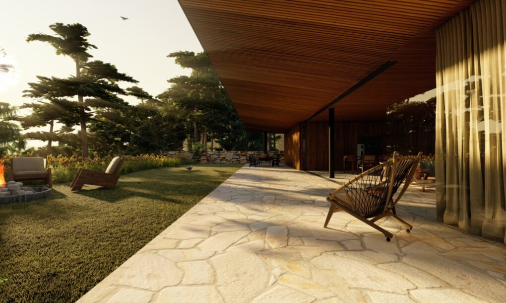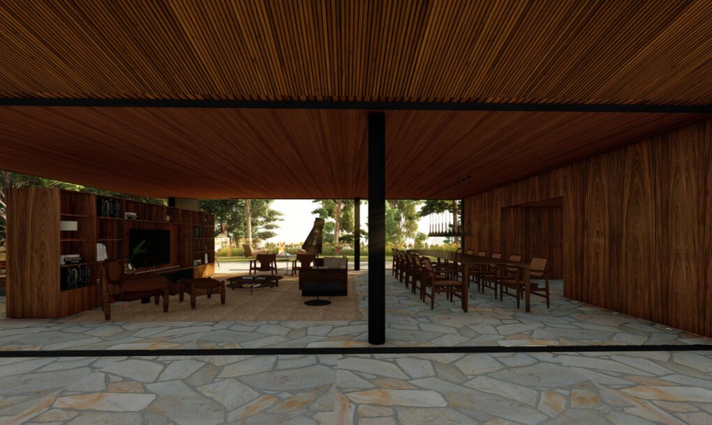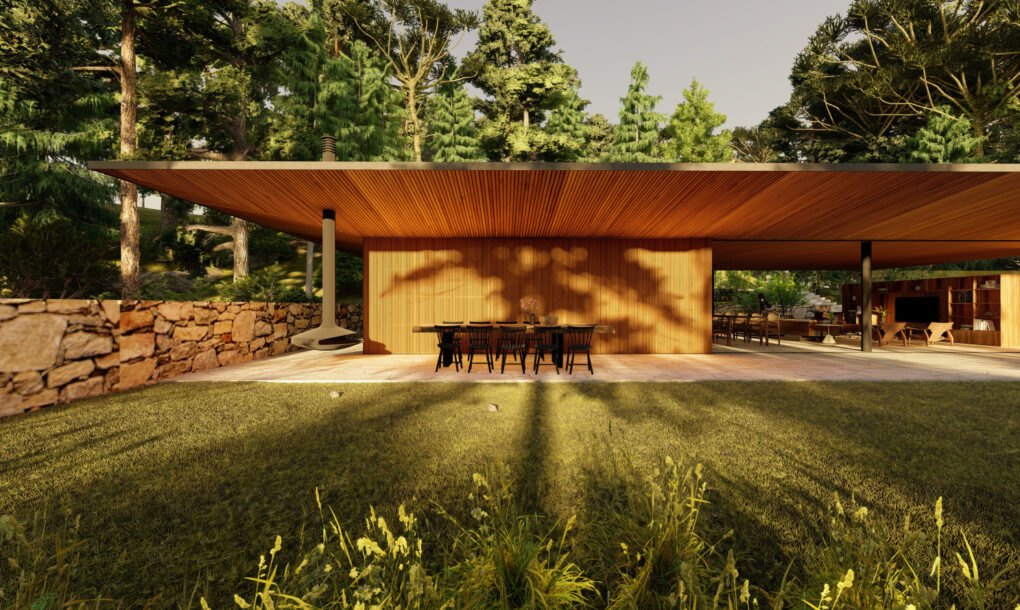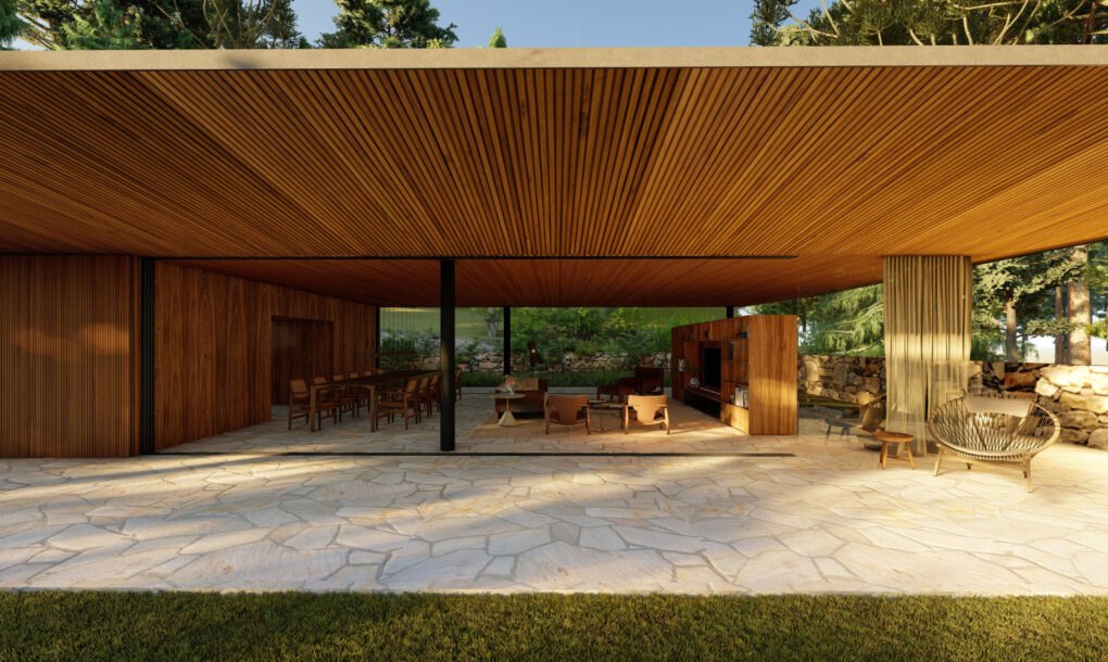 Sustainability was front and centre of this build. Taking inspiration from the natural environment, this spectacular home was built using stone, glass, wood, and concrete. Wooden-clad eaves and panels of folding Brise Soleil are used to reduce heat gain by deflecting sunlight and keeping the ventilation thermally pleasant throughout the year.