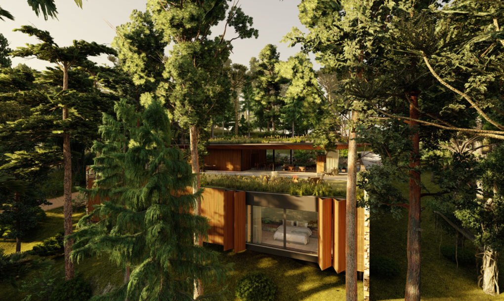 A sprawling green roof dominates. This is the true heart of the home. Here, a living room with floor-to-ceiling windows leads out to a wide, terrace. An outdoor dining area with a hanging fire pit ensures the family can utilise the outside spaces even in the colder months. And in the bedrooms, more floor-to-ceiling windows ensures the indoor-outdoor living experience continues from the moment of waking until sleep.