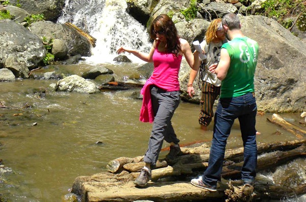 Bulent helps a group cross a river during a hike, wearing his characteristic hiking uniform: designer tee, tight jeans, and branded sneakers.