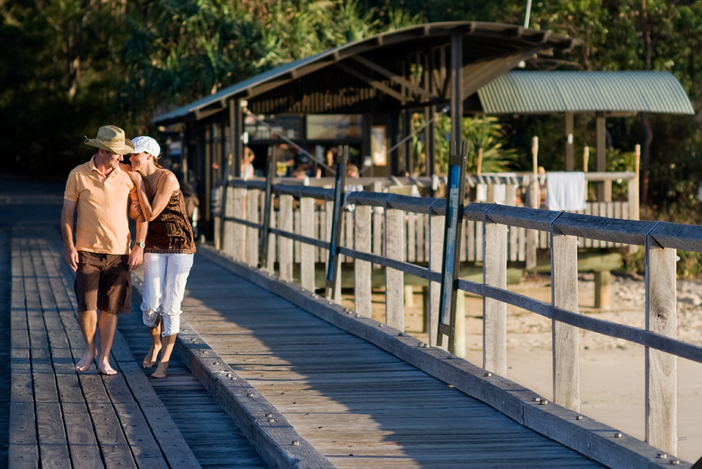 Kingfisher Bay’s jetty hut is a great place to sit and watch the sun set over