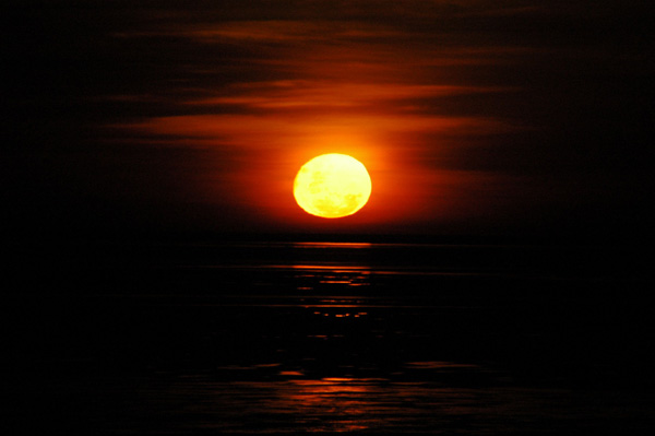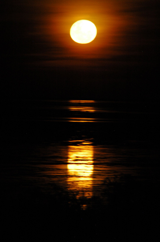 Like a ball of burning amber, the moon floats higher and higher above the water. Its reflection lights the striations of the corrugated mudflats in a narrow line below, giving the impression of a flight of burning stairs leading right to the moon.