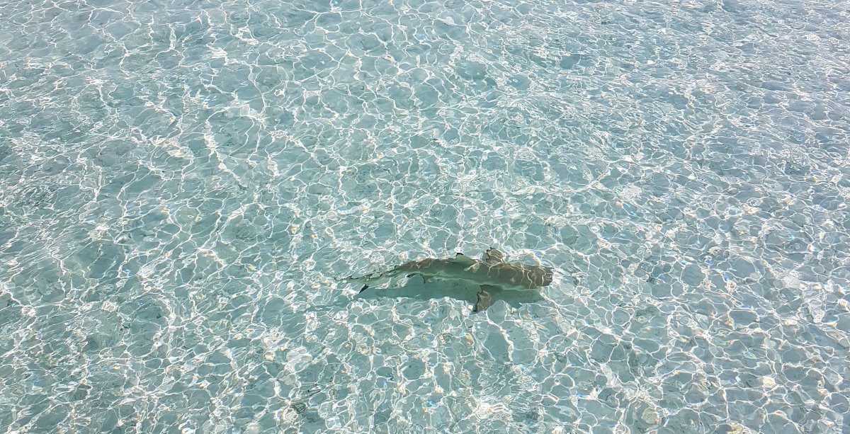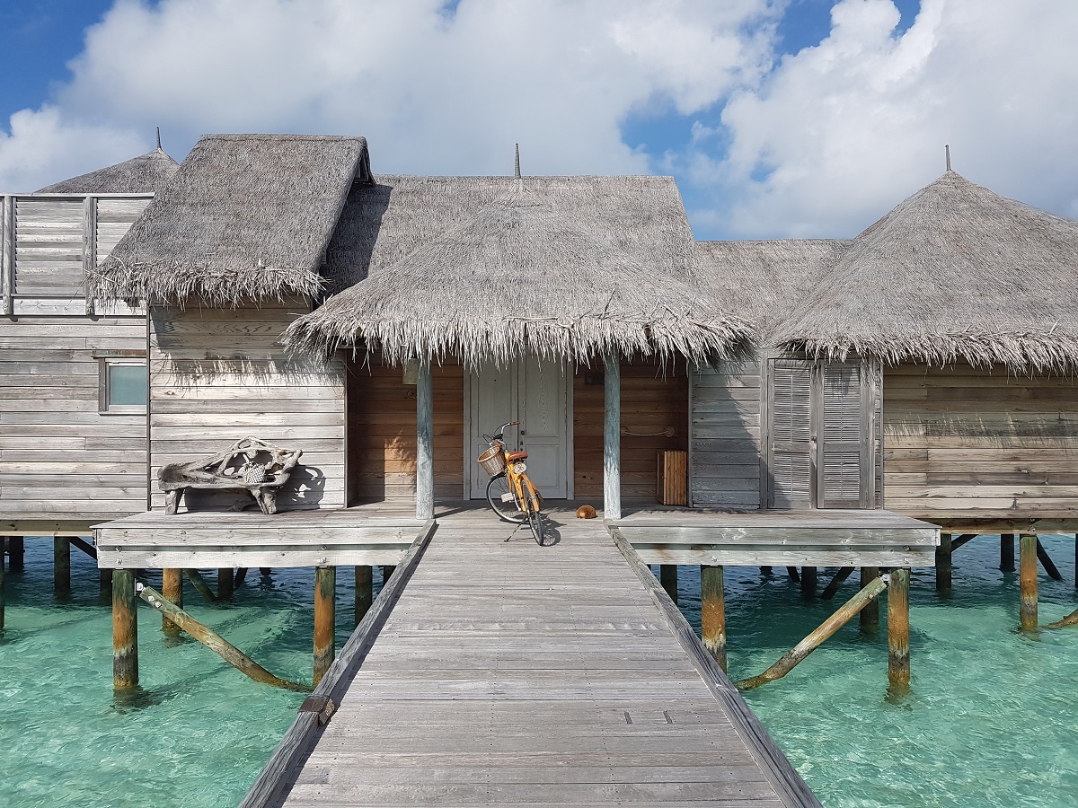 Cycling along the jetty, I spot a dark flash in the water just outside my villa. A pectoral fin breaks the surface. It’s a black tip reef shark. Not too huge; about a metre long. I park the bike by the front door and fumble for the keys in the depths of my tote, still keeping track of the shark. It disappears under the villa.
