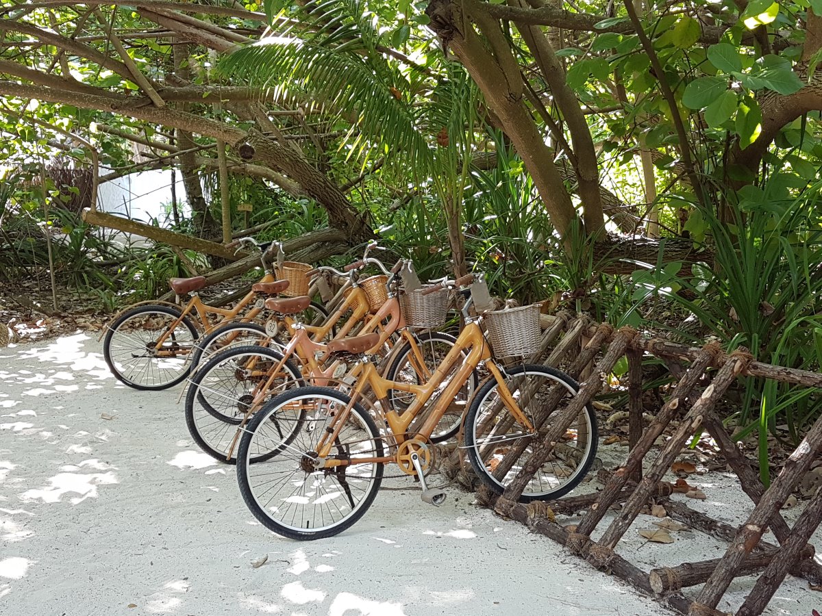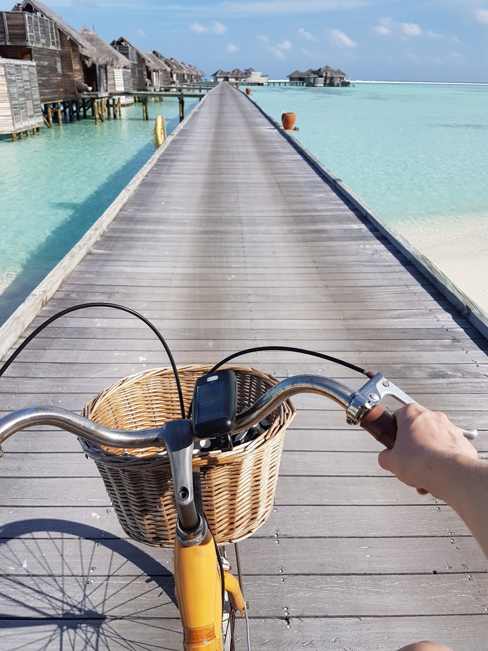 Lunch is in the Overwater Bar, a circular bar and restaurant reached by a jetty from the beach. I take my bike and park it up just outside on the sand. It feels weird on the first day to walk into a restaurant with no shoes on, but I quickly get used it.