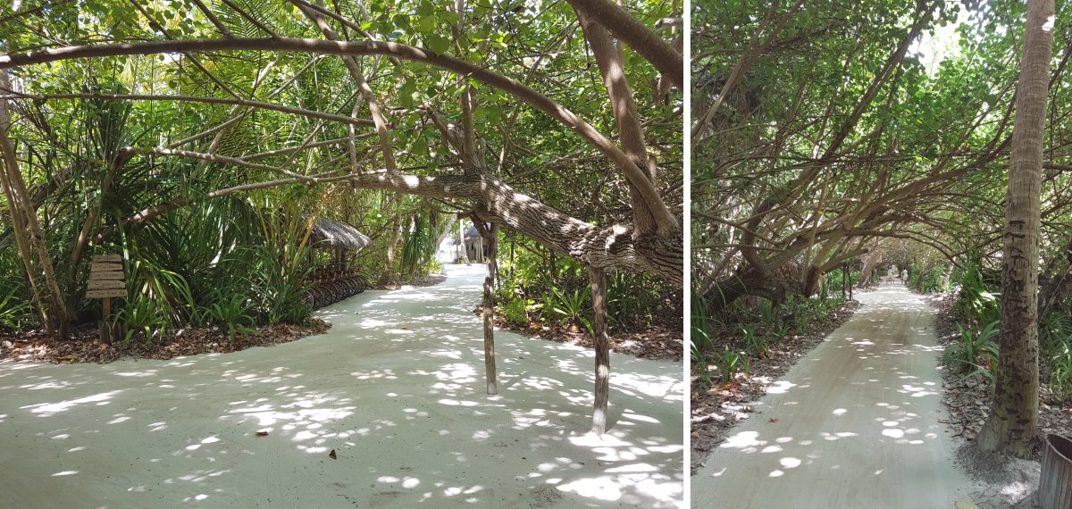 The covered walkways provide natural shade from the sun. The branches are shaped and intertwinned to form a natural canopy. Some of the tree’s branches are held up by supports instead of cutting them off.