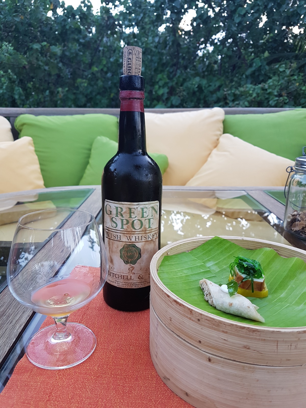 One of the courses during the ‘Gili Tasting Journey’. A rare 1972 bottle of Green Spot Irish Whiskey accompanies two serves of Maldivian smoked fish.