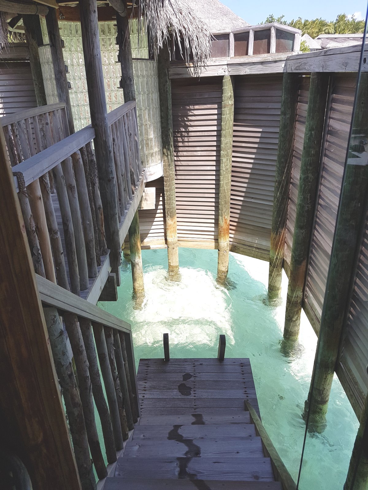 The tide is coming in, bringing with it more fish. Before the water rises too high, I swim around to an enclosed section of the villa and duck under the lowest beam into what they call the private bathing area. I saw another puffer fish here earlier hiding under the steps, and a few crabs hanging out on the beams so I go to check them out.