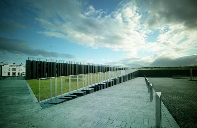 The site for the visitor centre at the Giant’s Causeway is located below the ridgeline on the landward side of the cliff. By utilising the large difference in level across the site, two folds are created in the landscape. One, extending the line of the ridge, accommodates the building. The second, extending the level of the road, accommodates the car park screening it from view.