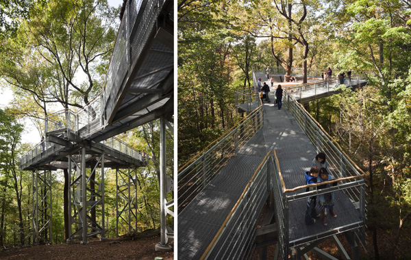 The steel micro-piles don’t hurt the trees roots like cement ones would, and help hold up the 450 foot long walkway and suspension bridge. The walkway is made out of harvested back locust wood decking, which doesn’t need to be pressure treated and withstands the test of time.