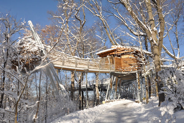 As with the previous treehouses, the structure doesn’t actually touch the trees – they’re protected with wooden slats and stabilizing fabric. In case of any weather damage, each piece can be repaired separately. Furthermore the whole exhibit can be moved if necessary with cranes and reassembled.