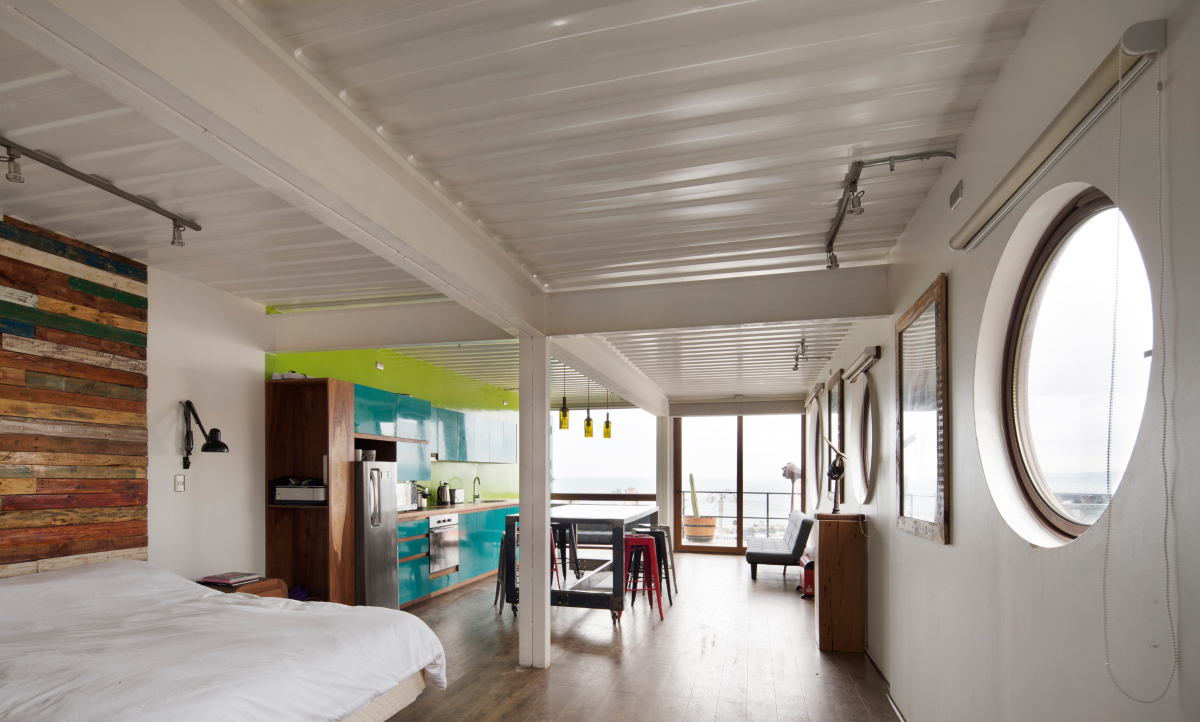 The hotel doesn’t shy from his past, the container aesthetic never hidden nor the obvious upcycling methods Phelps used. Rooms are insulated with newspaper and furnished head to toe in reused materials. My room is the Suite, a large rectangular box lined on two sides with floor-to-ceiling windows. The view is a heady one; far below I see the smaller hills that gently fold into the port.