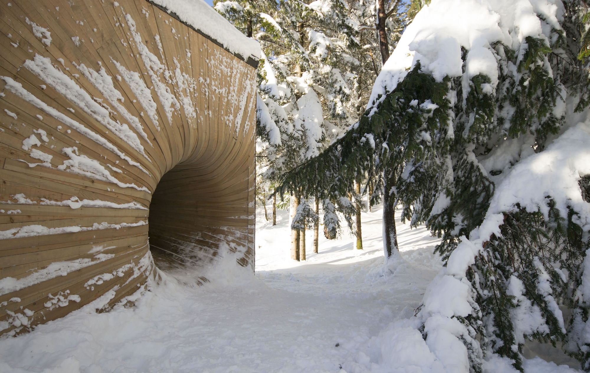 Tubakuba’s most interesting feature is perhaps its entrance. Inspired by the funnel of a brass instrument, layer upon layer of Norwegian pine was first soaked to avoid cracking and then shaped when wet to achieve the curved opening. It makes for an interesting first impression. While young guests may enjoy hopping in and out of Tubakuba’s unique entry way, crawling through the same space may pose a challenge for parents’ old bones and creaky joints. However, the spectacular view when from within the eco hotel is enough liniment to cure all.