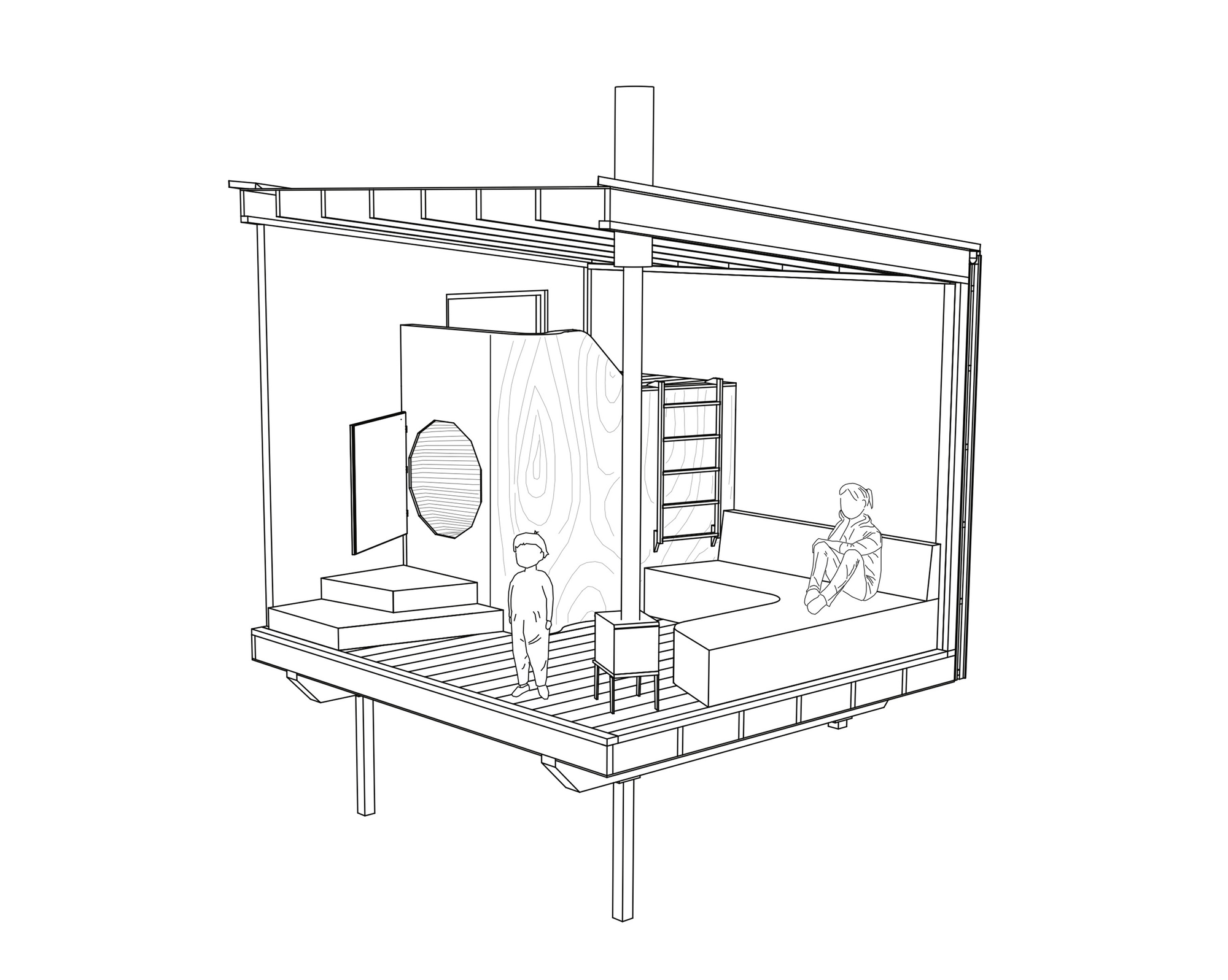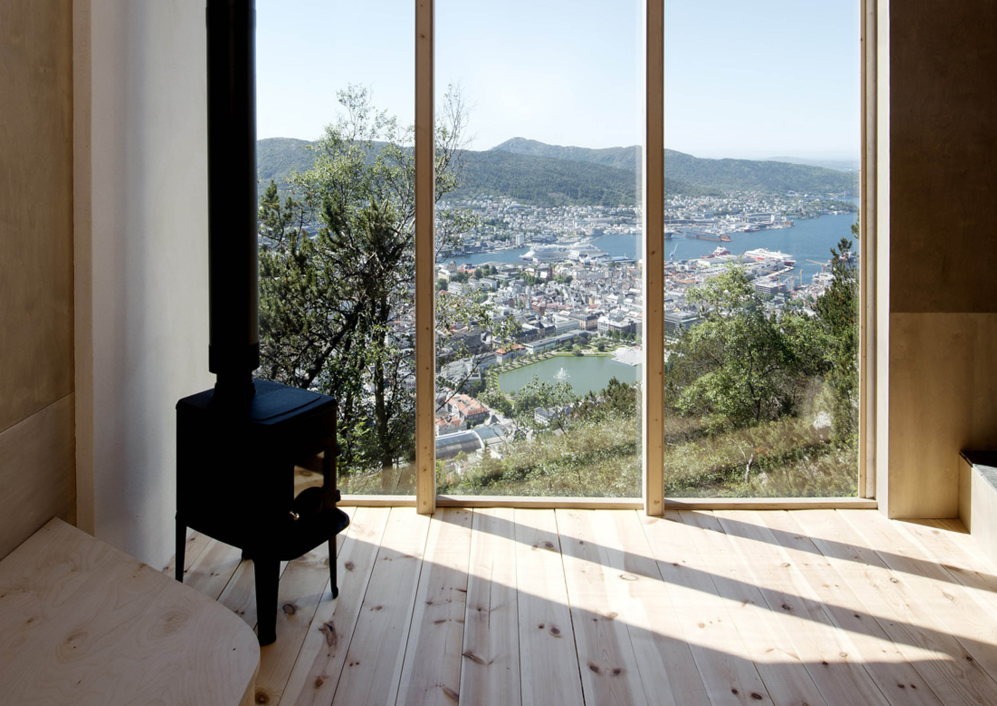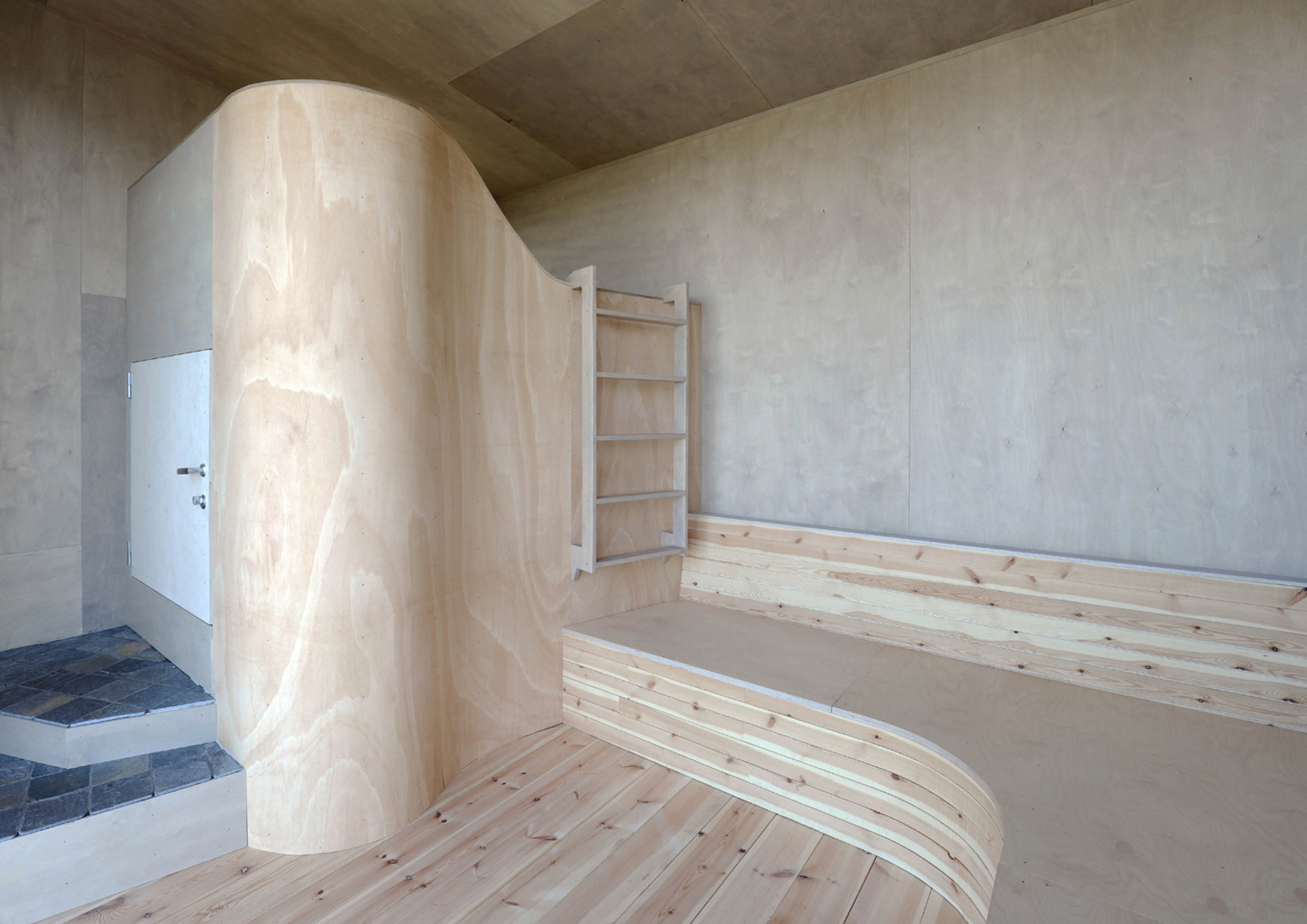 Inside, the walls are clad in plywood and all furniture is built-in, including a loft-style bed and wood-burning stove.