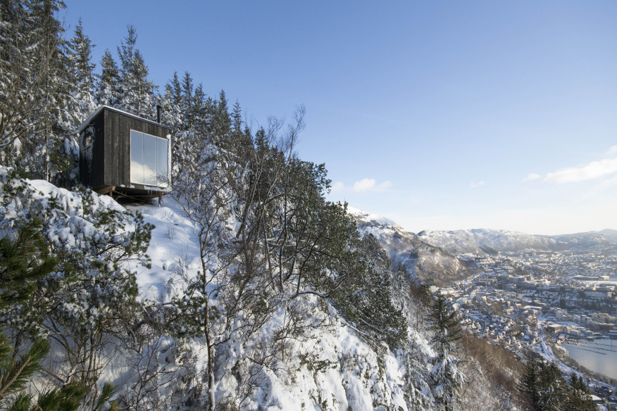 Perched on the edge of a mountain outside Bergen, Norway is a log cabin like no other. Far from the classic appearance of a mountain cabin, this unique eco retreat is a 14-metre-square cube made from recycled wood remnants. It also happens to be Norway’s only off-grid hotel.