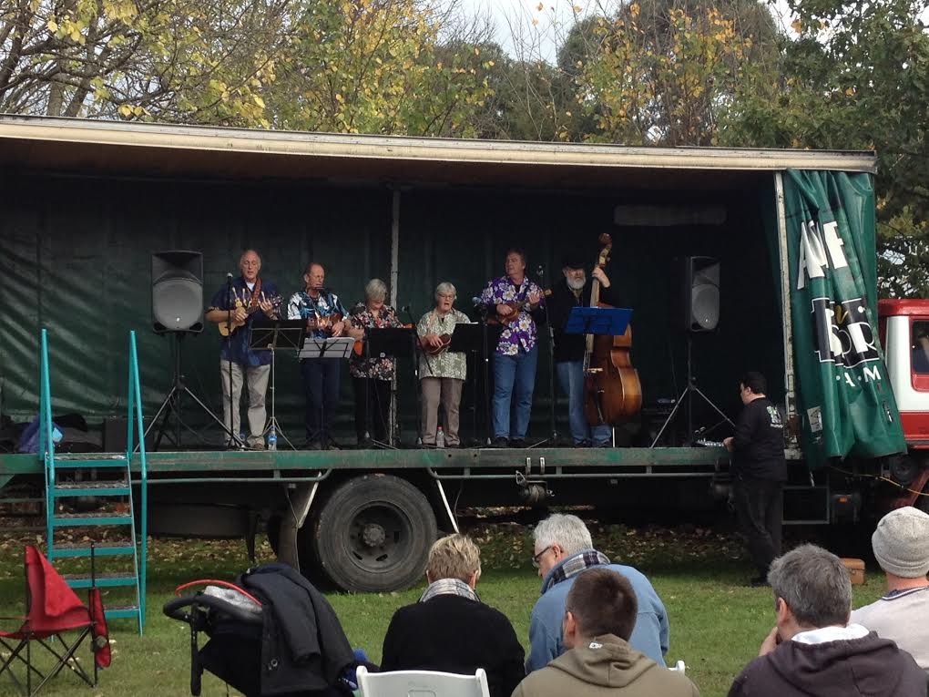 The local firemen have produced a fire engine for children to clamber over and take turns pushing the siren button. While a ukulele orchestra in the open-sided truck-come-stage strum and strain to be heard over the noise.