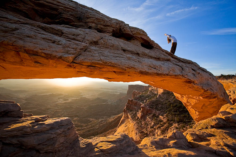 Lis Lilja, owner of Moab Yoga on the Rocks, practices yoga in Canyonlands National Park, Utah atop Mesa Arch. Image: Jen Judge via Moab on the Rocks.